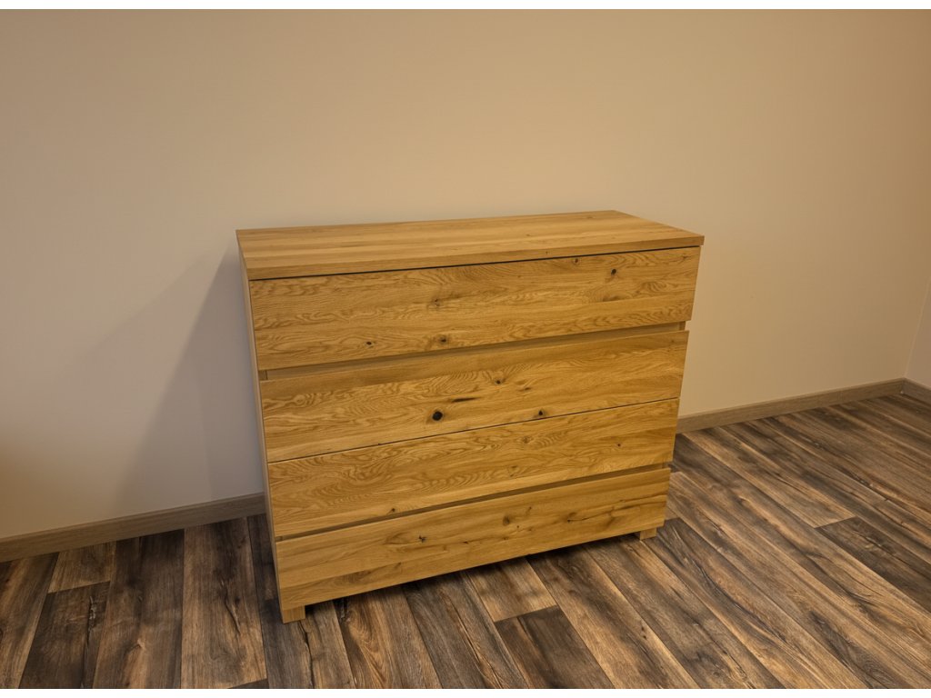 Transparentní povrchová úprava zvýrazňuje kresbu dřeva a podtrhuje individuální strukturu každého kusu. Komoda díky tomu nepůsobí pouze jako úložný nábytek, ale jako plnohodnotný prvek interiéru, který obstojí i v čase.