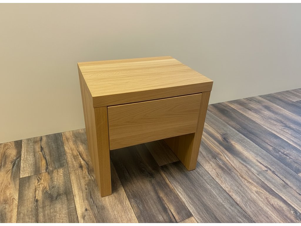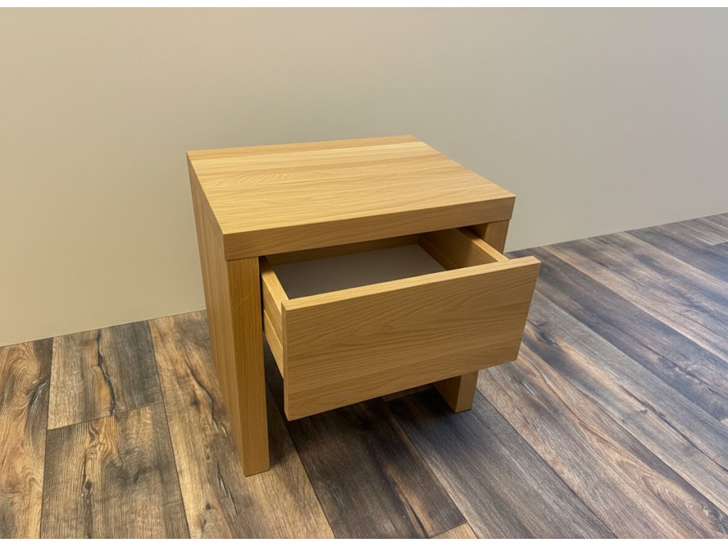 Stolek je osazen jednou zásuvkou s plnovýsuvem a tlumeným dovíráním, která umožňuje pohodlné a tiché každodenní používání. Absence otevřené police podtrhuje minimalistický vzhled a udržuje čistý a uspořádaný dojem.