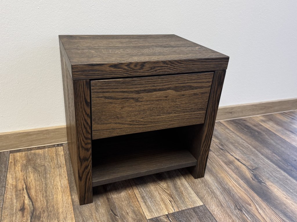 Noční stolek Safír je ideální volbou pro ty, kteří hledají pevný noční stolek z masivu v tmavším provedení, jenž spojuje funkčnost, stabilitu a jednotný vzhled ložnice.